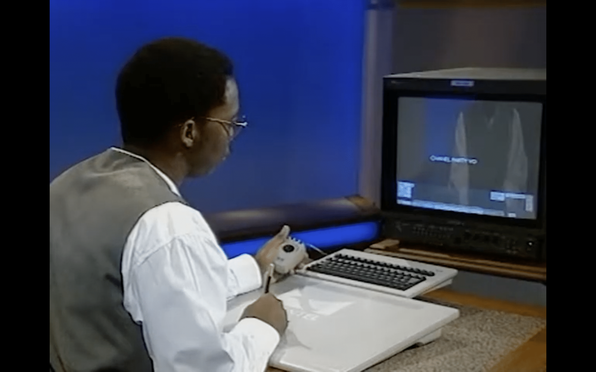 A considerable 30 minutes of memory for the time. In an incredible 720 × 576 pixels. But uncompressed. This memory was then distributed across two so-called Dylans. These were the Henry’s disc arrays and if you wanted to keep your discs in the right place, you’d better carry them in pairs. So, one mainframe, two Dylans and – bang – 24 units were occupied in the rack. Because you didn’t put a Henry under or on the table, but of course he sat in the cooled technical room. The artist was then given a keyboard in his suite, a – let’s say – generously sized tablet with a pen and a hardware accessory that is really hard to imagine today. A kind of thumbstick that you could hold in your hand, with four buttons arranged above it. Quantel officially called it the Hand Control Unit, everyone else called it a rat. And what did the future Henry Artist view his work on? On a class 1 Sony PAL monitor. The Henry was not familiar with a dual-monitor layout.