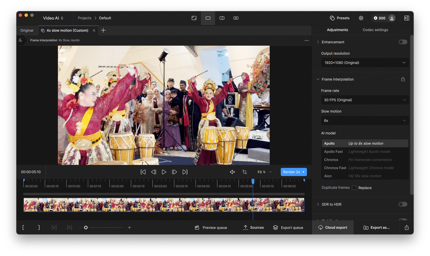 You can help Twixtor Pro as a plug-in to get pretty perfect results with masks and tracking points, but it’s not really easy to use in DaVinci Resolve or other hosts, as explained in my older article. The standalone version is rather simplified and straightforward, which can be very helpful for beginners. So, we also used standard presets for Speed Warp Better and the model offered in TVAI automatically for slo-mo without scaling, which is now Apollo. Fine tuning can result in even better results from both of these. TVAI is offering only 4x, 6x or 8x of slo-mo, so we decided to try 6x, since 8x seems a bit too adventurous for such footage. We ran the tests on a M1 Pro MacBook with 32 GB under Sonoma 14.7.2.