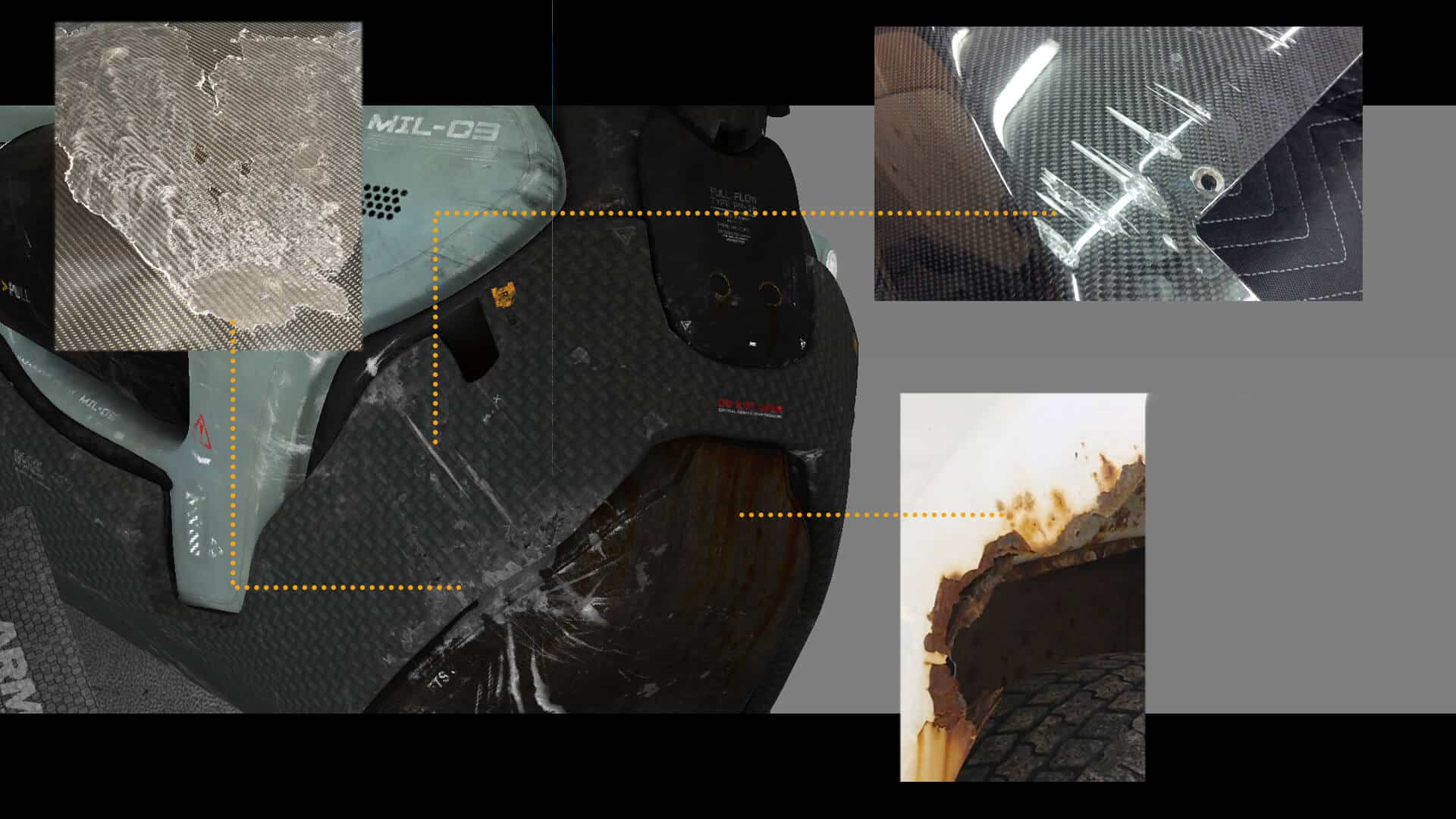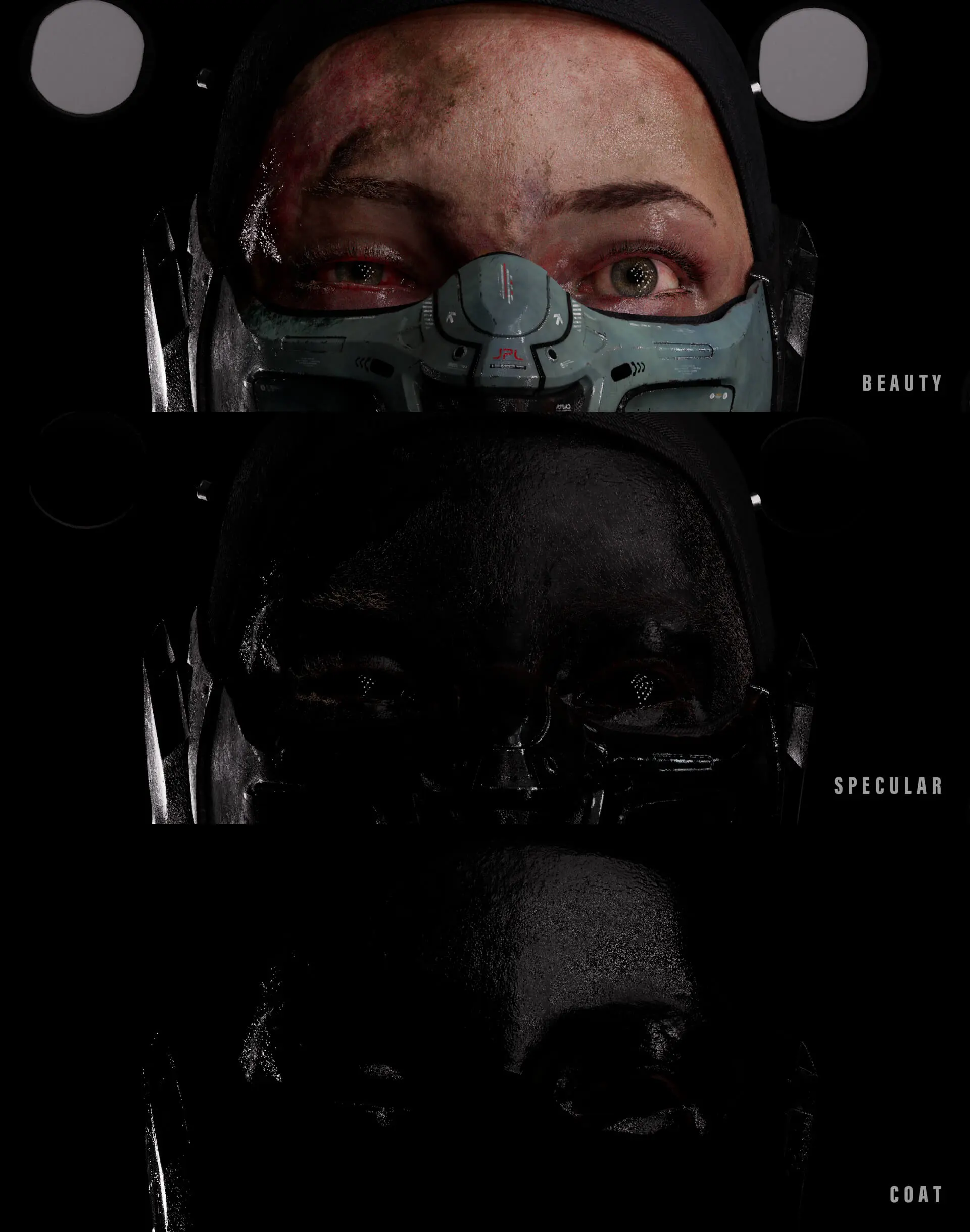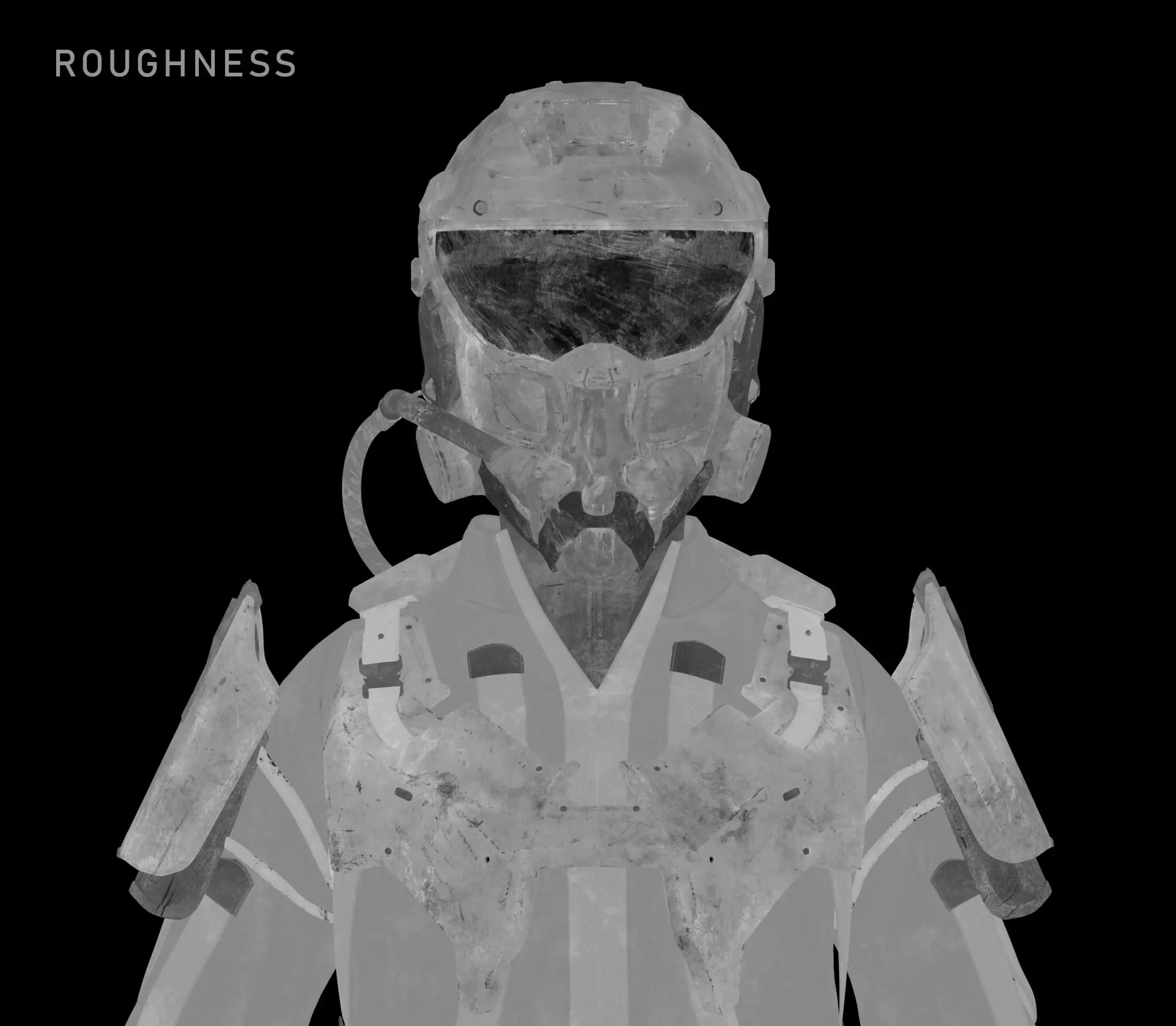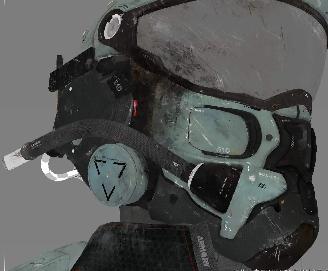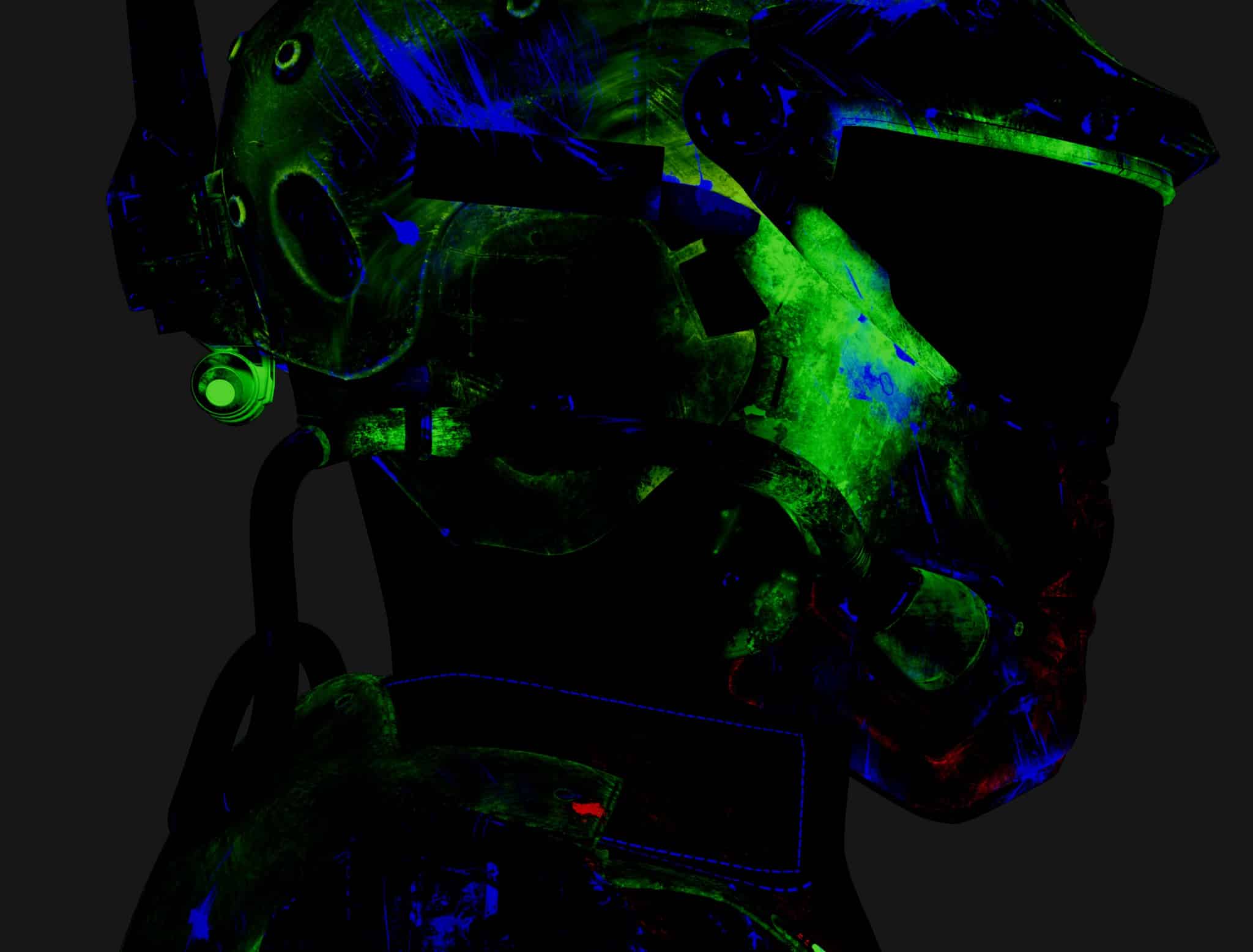 The process started with the base color, which received the most attention. Throughout the process, references were constantly consulted to replicate damage, dirt, and material irregularities as credibly as possible. A particular focus was on clearly separating the different materials (such as individual layers of metal, carbon, paint, wear, and dirt). This was not only helpful for maintaining an overview but also enabled the creation of precise RGB masks for look development. These masks later provided more flexibility in shading and allowed targeted adjustments to individual material groups. This workflow was used to work through the secondary layers, such as roughness, specular weight, coat, bump, displacement, etc. This gave the character more life, realism, and depth.