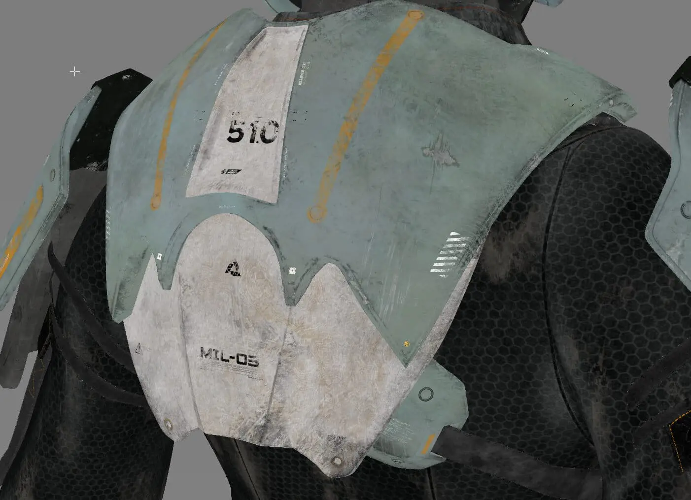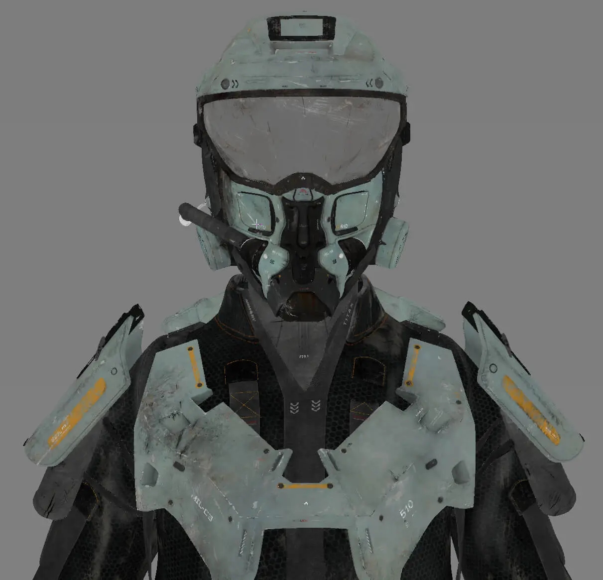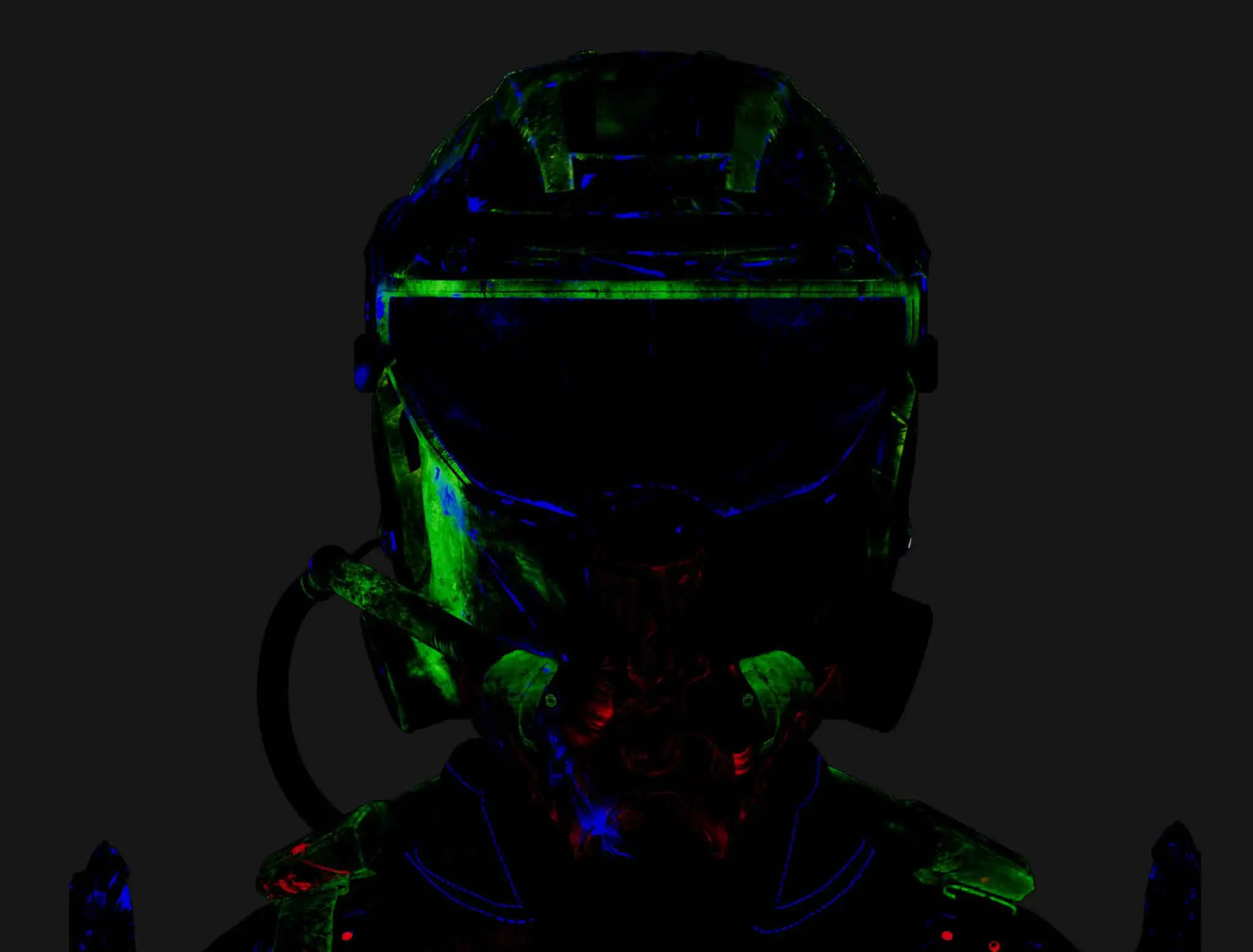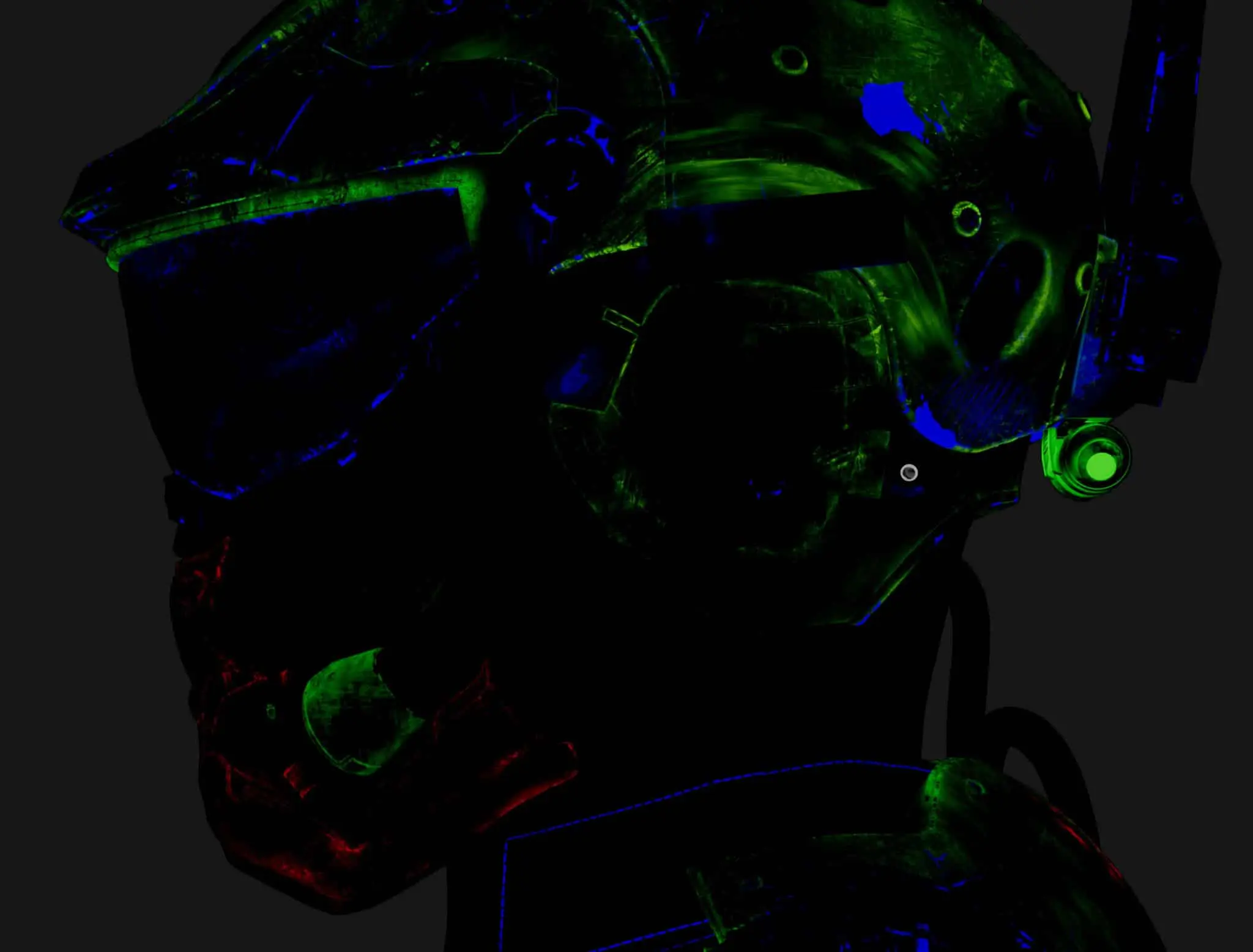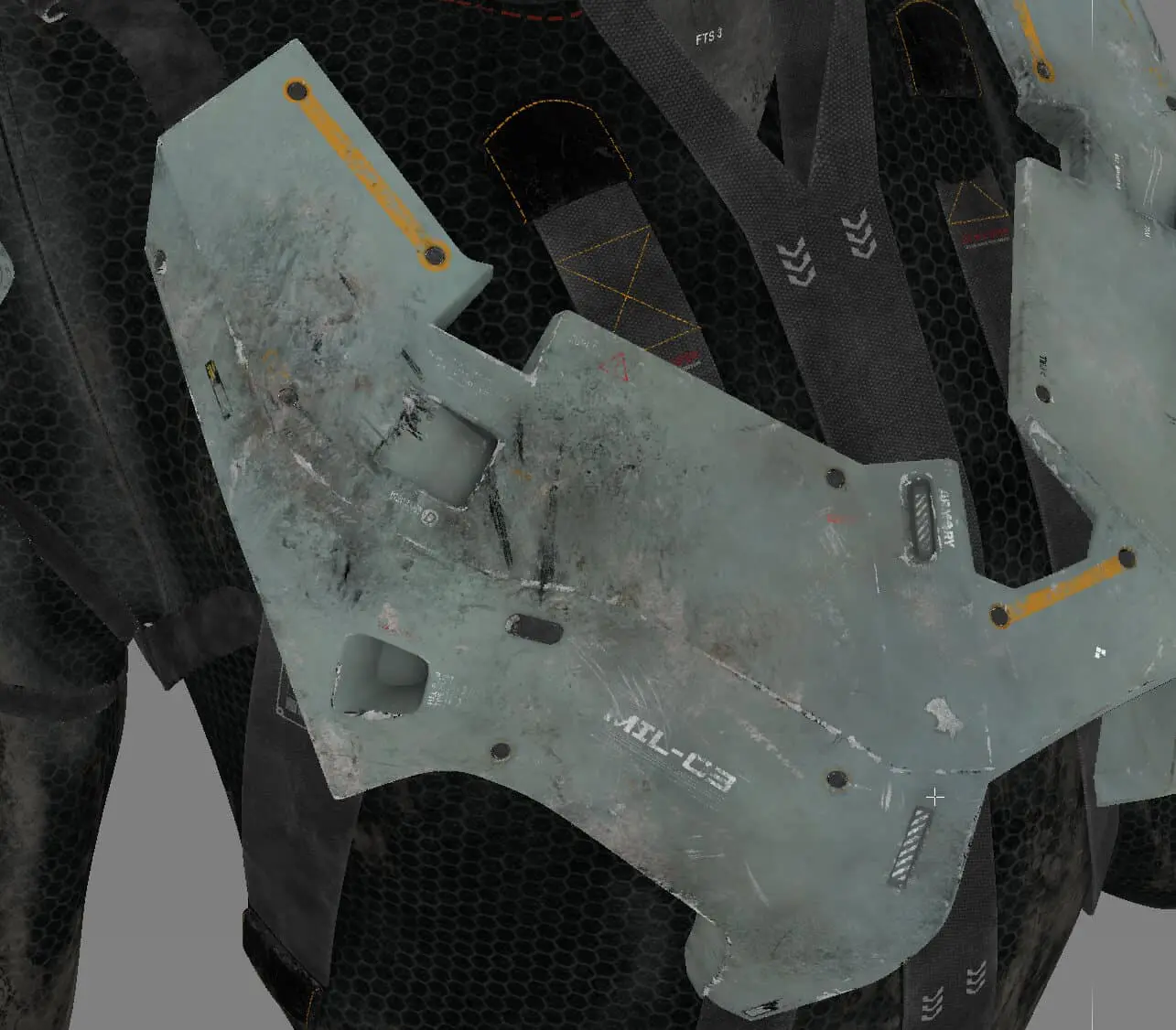 The process started with the base color, which received the most attention. Throughout the process, references were constantly consulted to replicate damage, dirt, and material irregularities as credibly as possible. A particular focus was on clearly separating the different materials (such as individual layers of metal, carbon, paint, wear, and dirt). This was not only helpful for maintaining an overview but also enabled the creation of precise RGB masks for look development. These masks later provided more flexibility in shading and allowed targeted adjustments to individual material groups. This workflow was used to work through the secondary layers, such as roughness, specular weight, coat, bump, displacement, etc. This gave the character more life, realism, and depth.