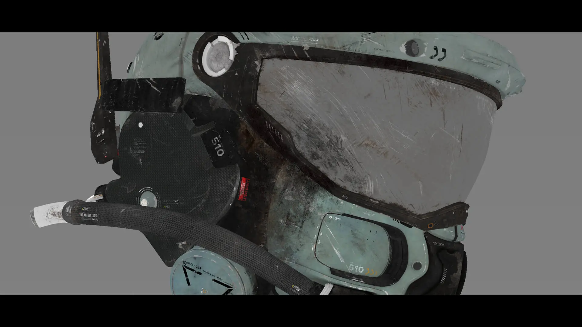 In this project, Julian focused on a variety of different surfaces: damaged, glossy carbon, peeling paint on metal, decals, realistic skin with blemishes, second-degree burns, as well as heavy, coarse fabrics. The goal was to showcase the full range of materiality and to tackle various challenges deliberately.