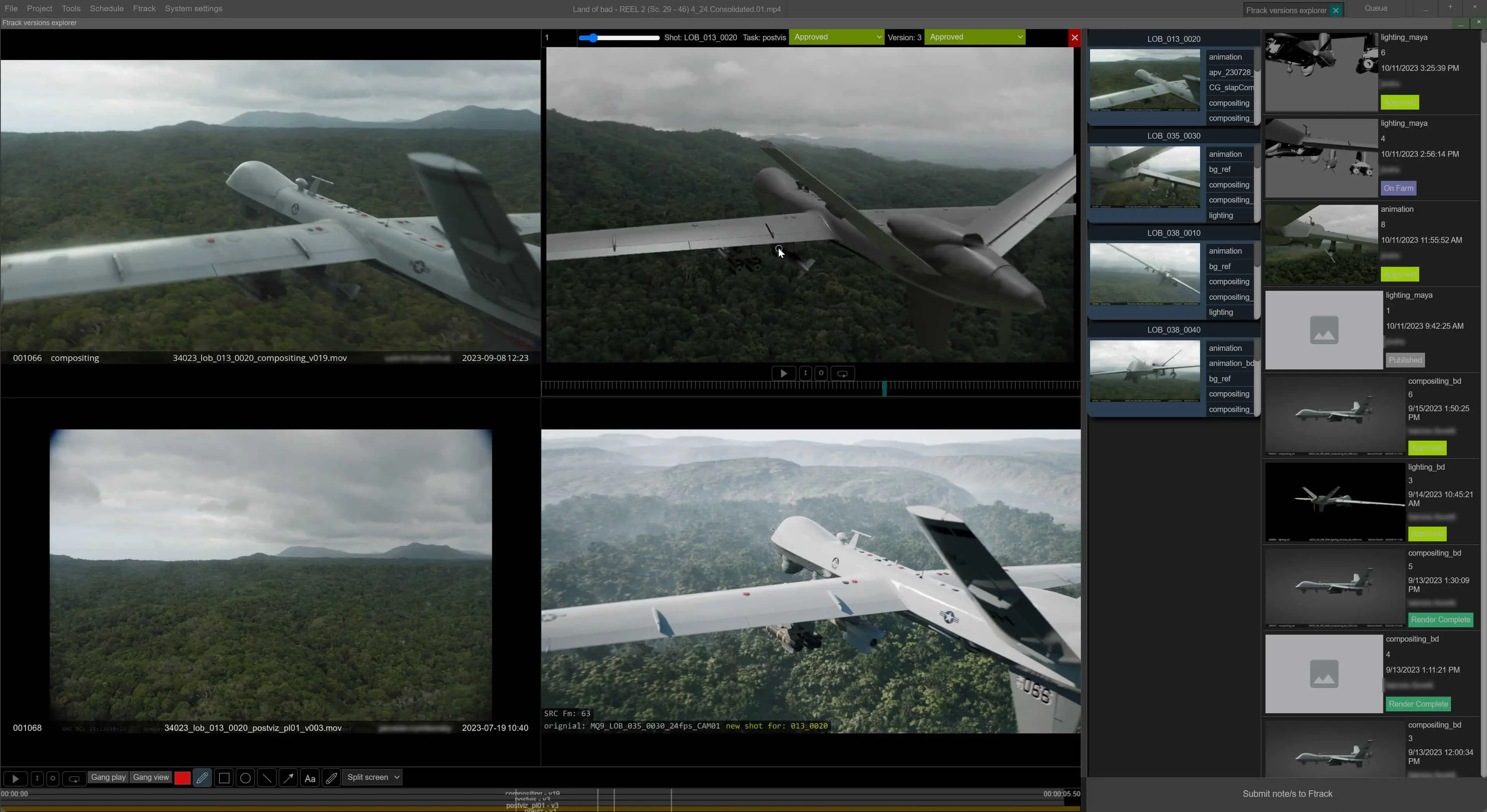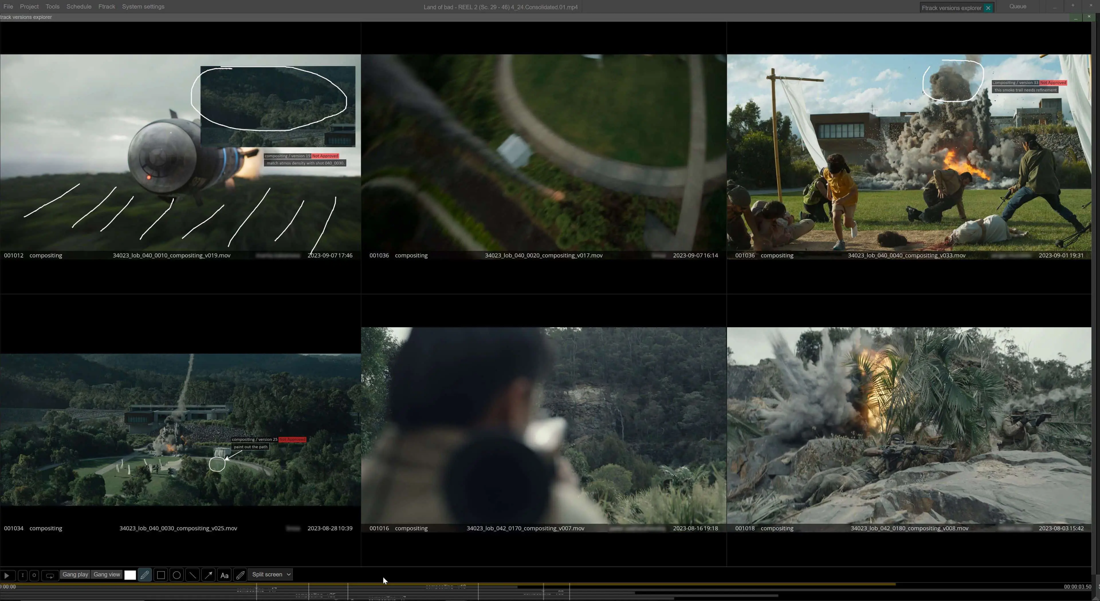 During active production, Crossbow primarily serves as a review tool. Supervisors can browse shots directly in the timeline, without switching between tools. For example, they can open 10 shots in a grid, play them back simultaneously, and comment either individually or in bulk. We often use it during client calls, set up a board of shots, add notes, and quickly navigate between different parts of the film.