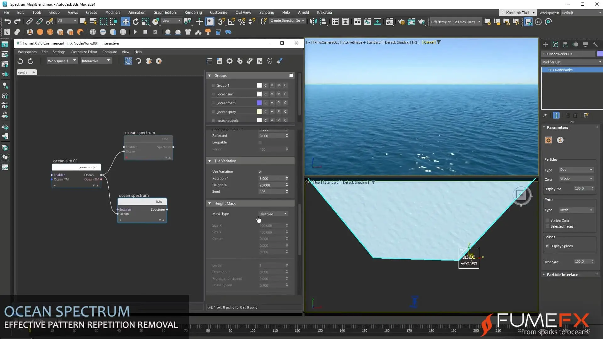 NodeWorks Ocean employs spectrum‑based wave models and inverse Fourier transforms to generate physically accurate surfaces. Artists can layer multiple Ocean Spectrum nodes to mix long swells with short, choppy waves. Variation is supported via Perlin noise blending, tile variation and height masking to avoid visible repetition.