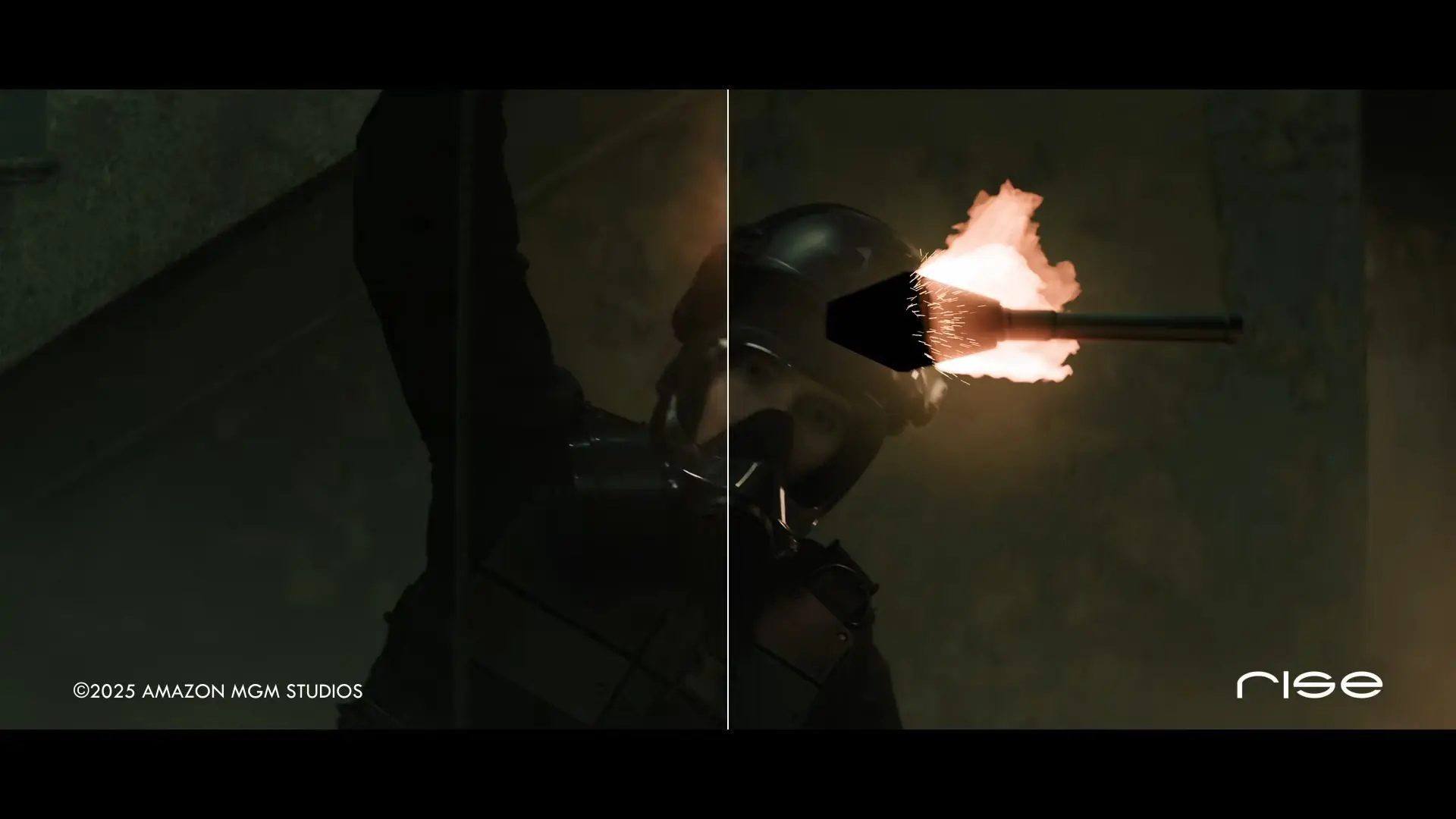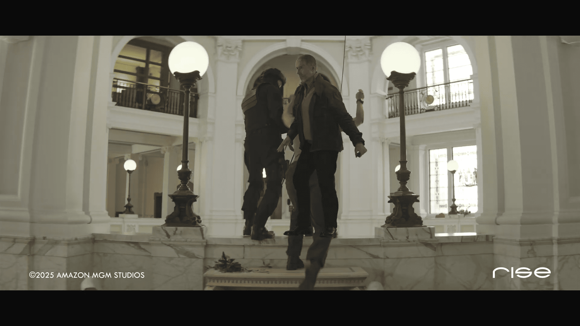 Alex: The show for Rise was just under 500 shots in 3 major sequences split over multiple sites with a very broad range of work required. The film is, in my eyes, a classic action film and it was great fun to dive into the tropes of the genre with bullet hits, explosions, car crashes and muzzle flashes. Beyond this, we had to handle digi-doubles, face replacements, set extensions, full environment builds, blood and, of course, statues.