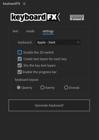 Right at the start, the user can also enter a text to be typed and specify whether the keyboard labelling is to be displayed. If you then click on “Generate Keyboard”, keyboardFX generates the corresponding layers in the composition (the text layers for the keyboard labelling are set to “shy”).