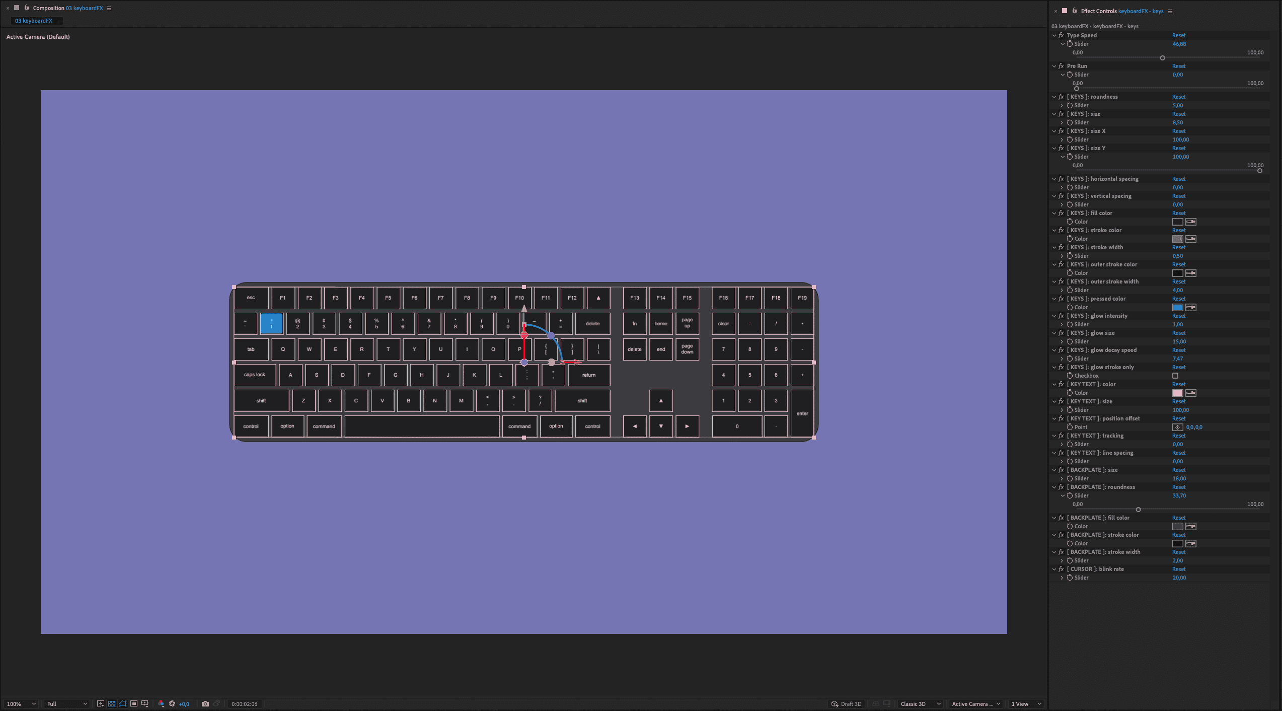 After generating a keyboard, the user has two shape layers available in the comp, each with its own effects control. For the actual keys, the user can use the slider to define the speed at which they are pressed (including an optional forward movement), the height and width of the keys, the colouring of the letters and the keystrokes as well as other tweaks for the shape and appearance of the keyboard housing. The user also defines the appearance of the keystrokes, i.e. the “glow” of the keys, via the “Glow” level. Each key on the keyboard has also been assigned a special command so that, in addition to simple words, key combinations or function keys can also be pressed virtually (Home, Arrow, F1 to F12, etc.).