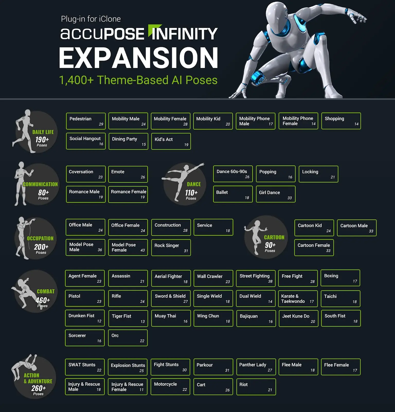 The AccuPOSE update also includes a new Cartoon category targeting expressive and stylised animation, alongside other pose themes such as Free Fight and Aerial Fighter. Updates beyond the current library will continue, but they will not follow a fixed schedule, according to Reallusion.