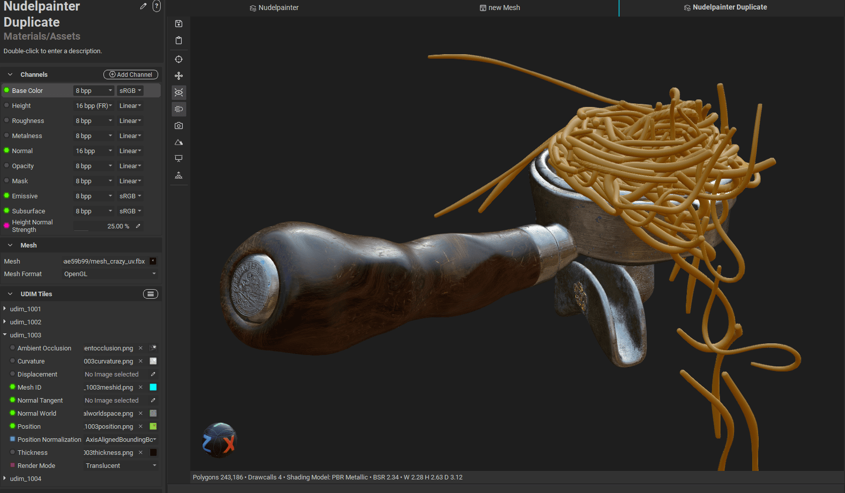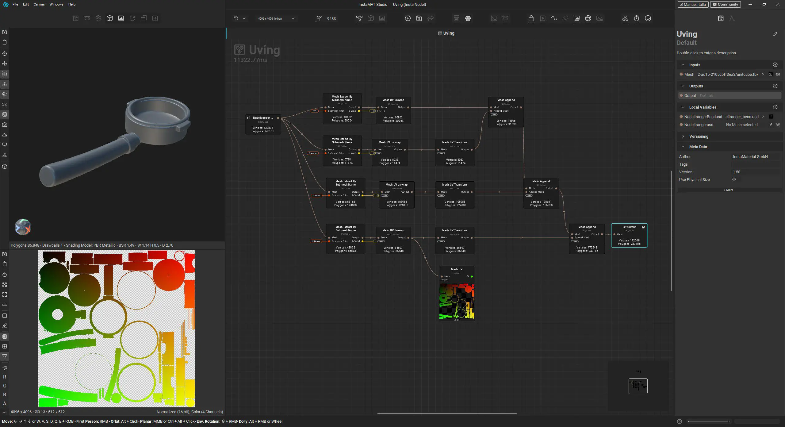 For our purposes, “Asset Texturing” is the obvious next step. Unfortunately, the modeller clearly had nothing but pasta on their mind and forgot about the UVs. According to InstaMAT, this is not a problem at all. This is where the mesh functionality inherited from InstaLOD comes into play.