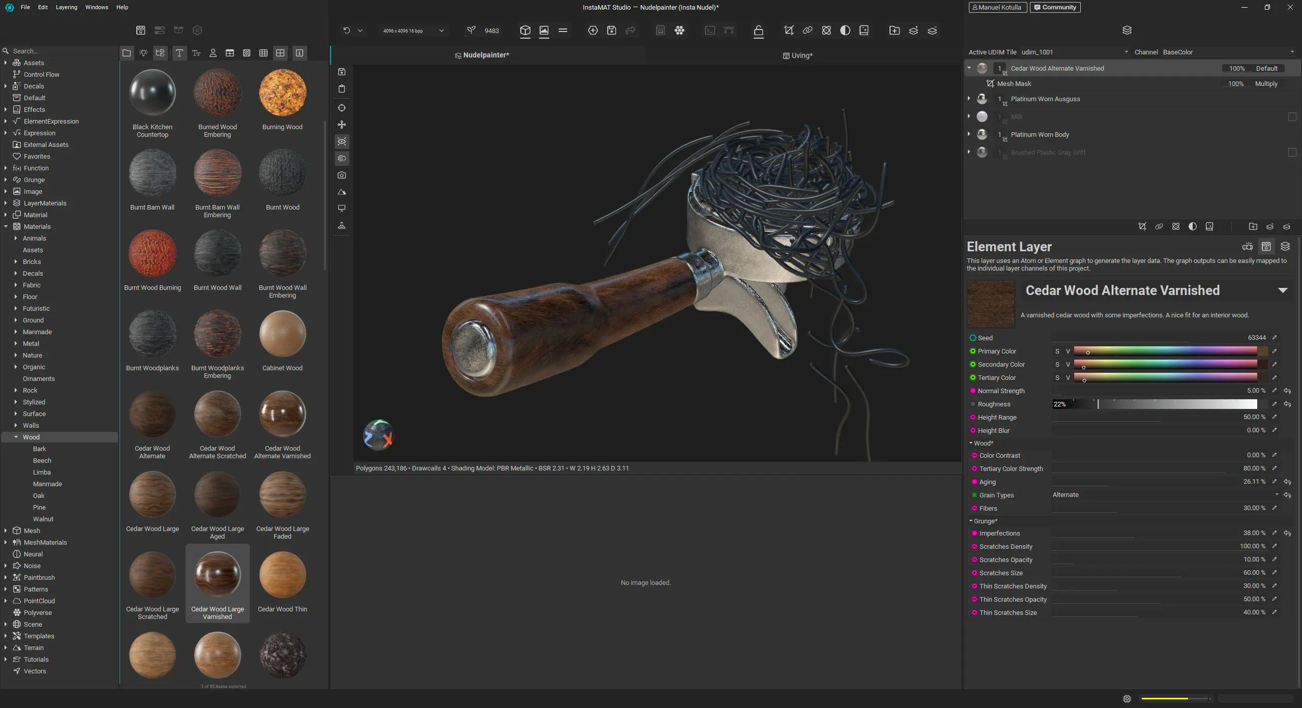 For the metal parts, we drag a nicely scratched, used-look material straight onto the mesh. Since all bundled materials are created in the Element Graph, they can also be opened there and adjusted down to the smallest detail. The black plastic is replaced with an oiled wood material from the library.