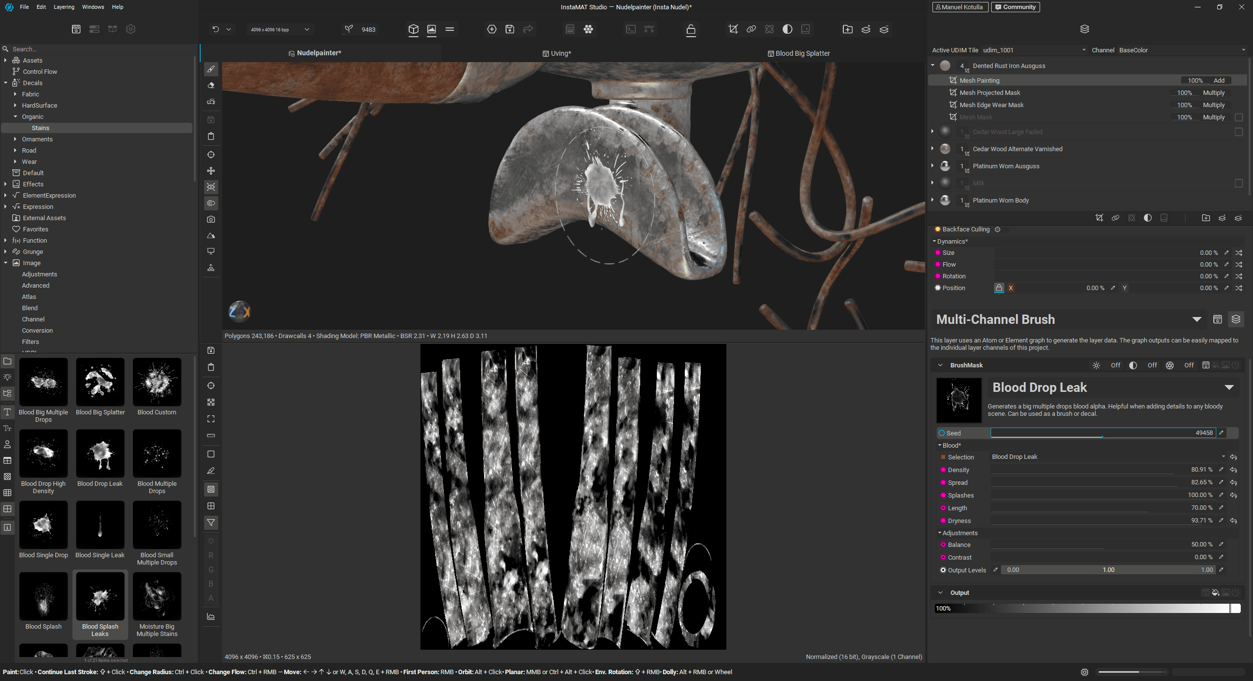 First contact with the brush engine happens through Mesh Mask Painting. Here, we can use a brush and repurposed decals as brush masks to add targeted stains. Once again, the interplay with the node graph becomes apparent. Under the hood, the stain decal is not a simple alpha image but a highly adjustable Element Graph. Parameters such as the number of splatters and the dryness at the core can be tweaked, and endless variations can be generated via the seed.