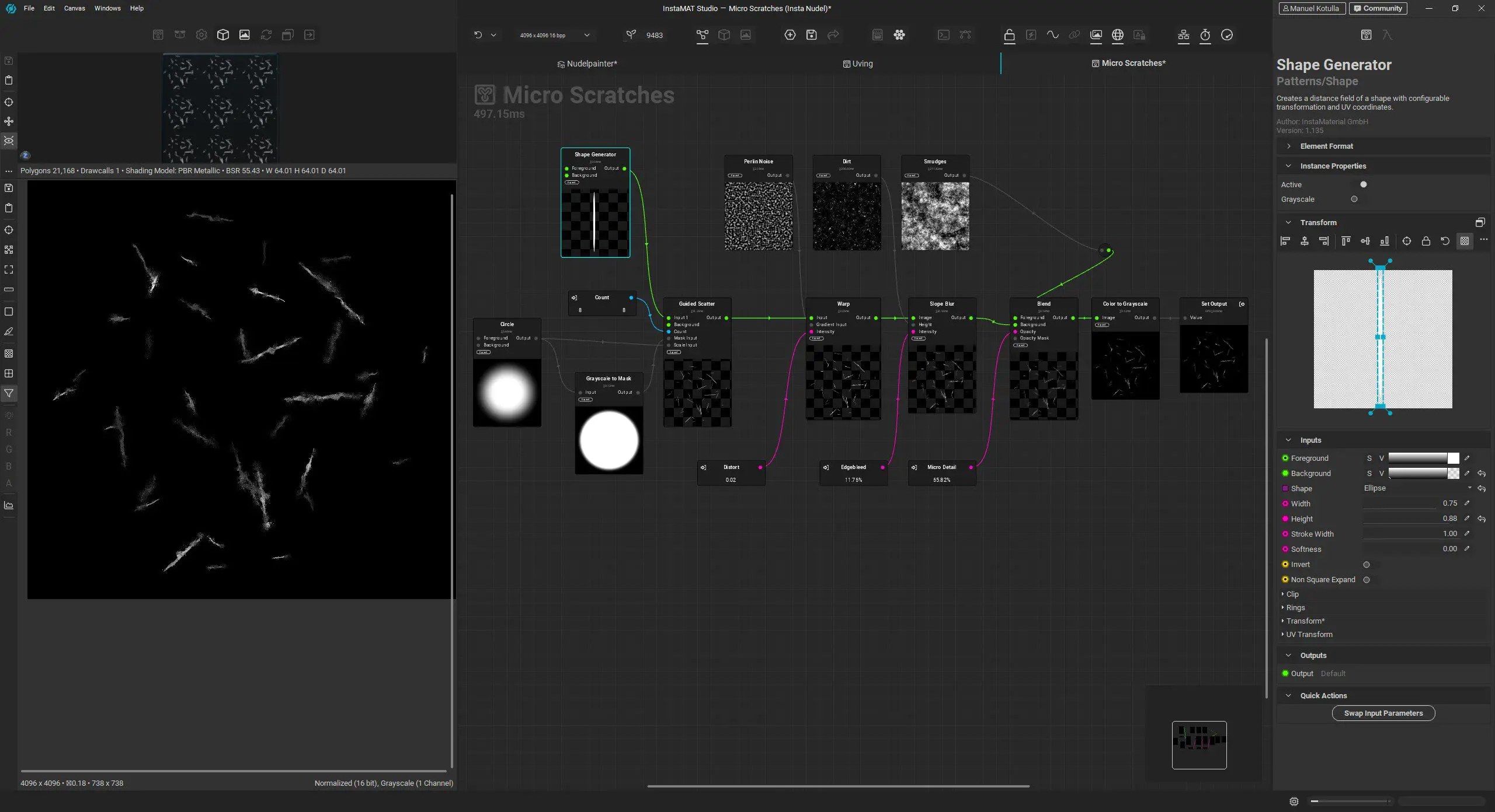 Element Graph operates in the vein of Houdini’s Copernicus or Substance Designer, providing a node-based environment for material creation. InstaMAT goes significantly further here, offering everything from automated mesh processing to terrain generation.