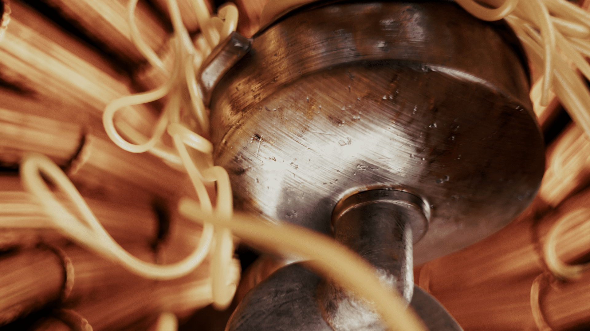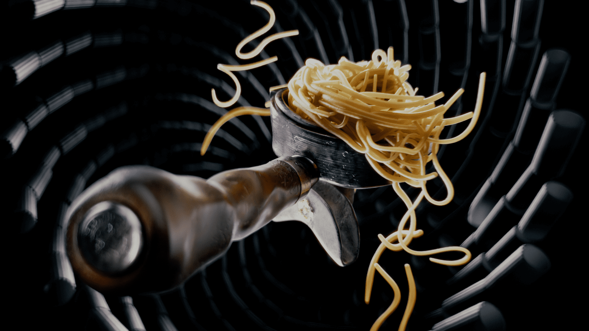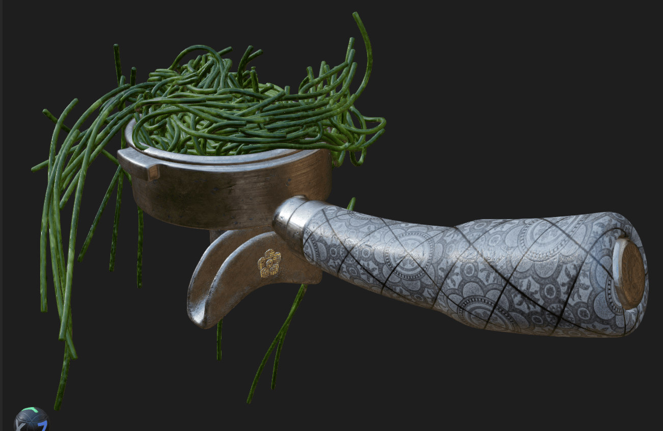 For our demo workflow, we need a suitable asset. Which object combines all materials in one place? Exactly, the pasta strainer portafilter. Wood, plastic, metal, and something organic. Quickly modelled in Houdini and exported as USD.