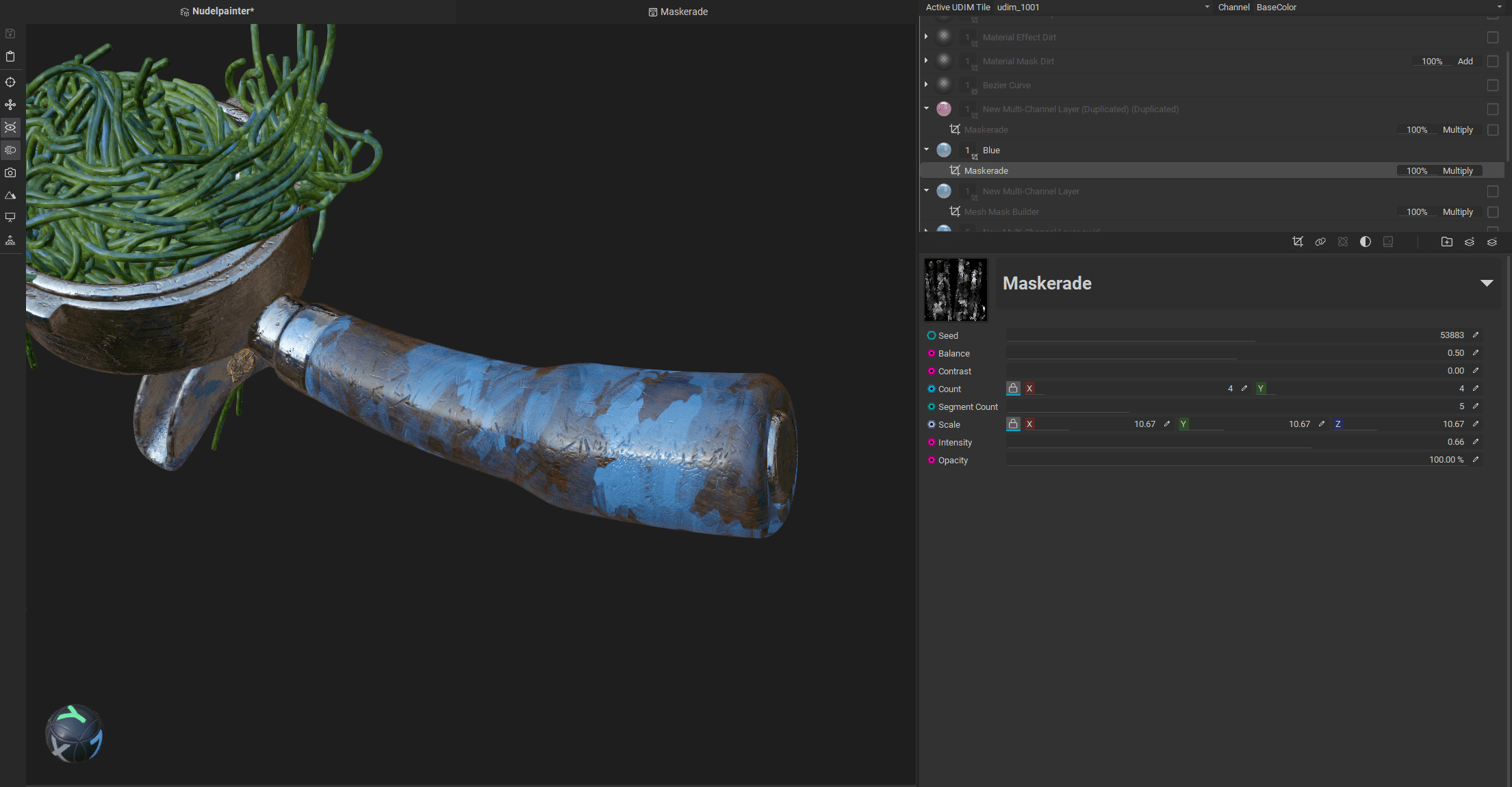 Once the prominent Save button in the top bar is pressed, the material becomes available in both the painting context and the node graph. From this point on, we can freely switch back and forth between the Materialize and Texturing tabs to refine the result.
