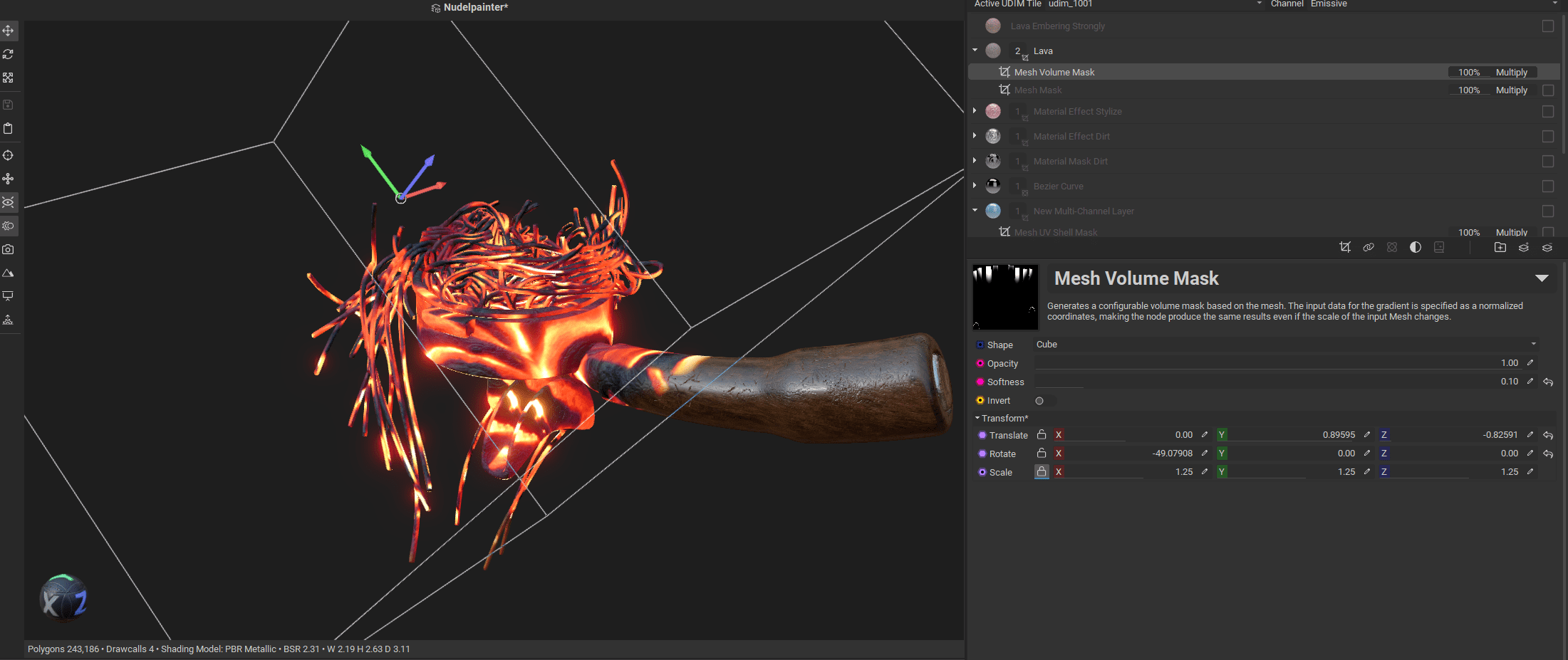 The decision to compute brush strokes in 3D space rather than 2D is a clever design choice that directly addresses the reality of changing base meshes and scalability. However, a few brush tools are still missing to fully satisfy dedicated hand-painting artists. Though those who primarily paint masks won’t find this particularly bothersome. Speaking of which, the masks are another major strength: clever generators and the interplay between masks (maps) make complex effects achievable very quickly.