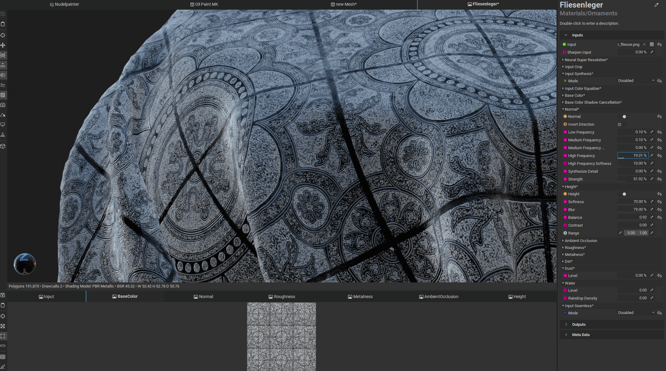 What if the handle is made from kitchen tiles? Time to test material creation from photos. To turn a simple smartphone photo into a usable material, we once again start a new project via the “+” button, this time choosing Materialize Image and selecting our image. In the next step, we already get a preview of the resulting material. The input image can be cropped or upscaled using neural assistance. The Color Equalizer normalises the image, while Base Color Shadow Cancellation removes lighting influences from the photograph. Individual channels can be adjusted separately. For example, roughness can be broken up using a grunge map. Optional dust and dirt effects can be added directly.