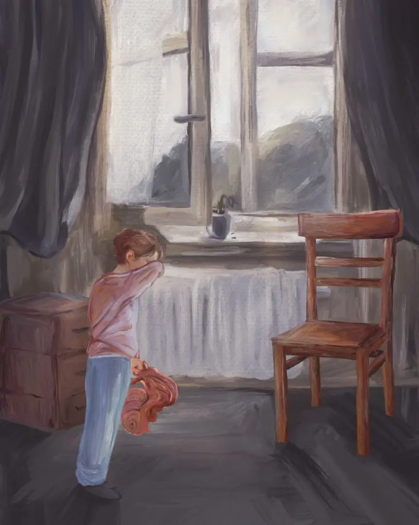 Each painting exists in two versions, each representing a fragmented glimpse into his memories or dreams. One version might show young Clarence playing with a toy rocket or receiving his stuffed snail from his mother. The second versions depict distorted pasts and desires, such as the boy as a real astronaut, abstracted with a snail shell instead of a head, or alone and silent in his childhood living room without his mother. The paintings act as clues to the character’s past. Four works were digitally painted in Procreate and printed on large canvases by Eva Maria Stiebler, framed in wood for the set. Two additional paintings were created as charcoal drawings on paper.