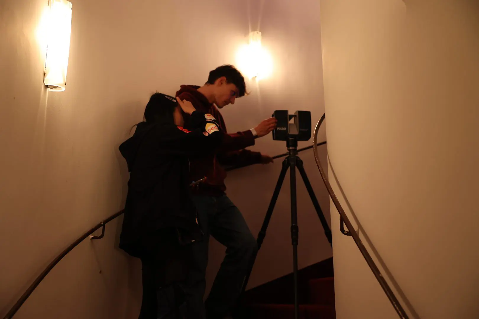 The final compositing step involved integrating the digital staircase into the original footage. With guidance from lecturer Martin Tallosy, Vanessa learned how to use rotoscoping in Nuke to create nearly invisible transitions between plate and CG elements. Martin supported the integration of CG footage into all VFX shots and helped with initial colour adjustments. Lecturer Ando Avila taught us to track handheld camera movement using 3D Equalizer, enabling Vanessa and Jim to transfer the motion to the digital 3D model. Working closely with our instructors allowed us to explore new tools and combine traditional sets with digital visual effects.