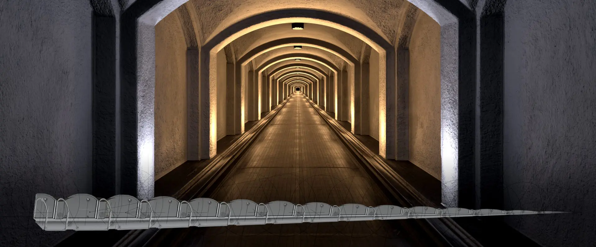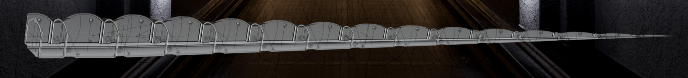 Simulating an infinite corridor directly would overwhelm most computers, so Jim devised a trick by scaling the corridor into depth. Viewed through Blender’s camera, the corridor appears endless. He developed a setup allowing control over both roll axis and depth movement. This resulted in a 50-metre corridor segment that, when scaled, created the illusion of infinity. Within this segment, movement allowed the corridor to emerge and disappear into depth.