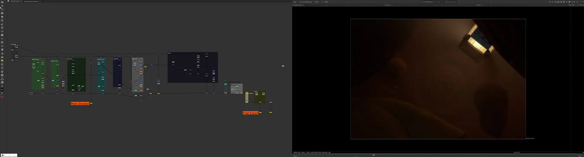 To integrate the realistic elevator into the surreal environment, Jim inserted real footage of the actors inside the physical elevator into the digital model opening. Emil added digital dust particles to intensify the ominous abyss and blend live-action and CGI seamlessly.