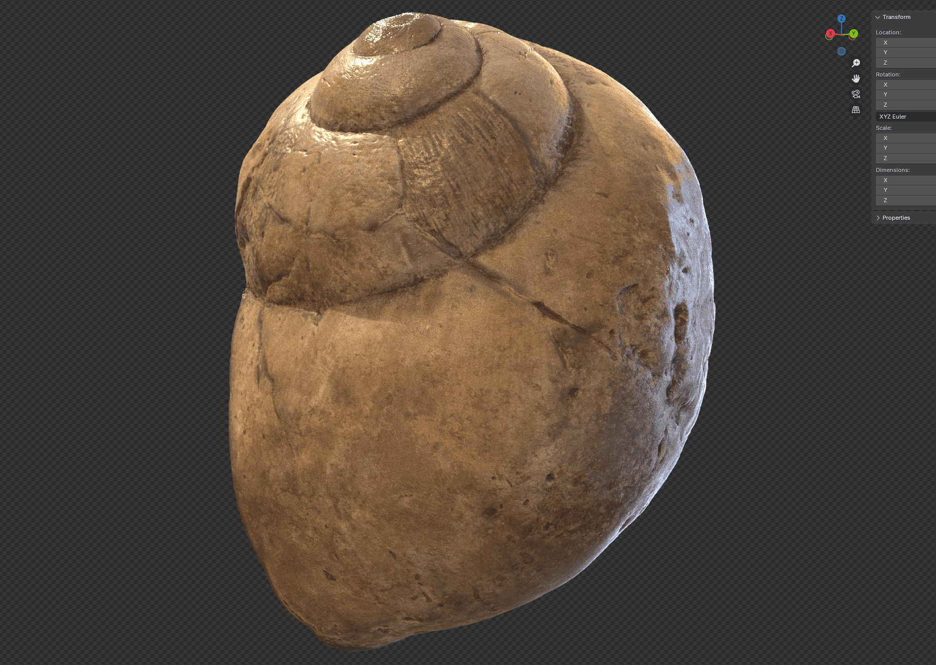 Texturing in Substance Painter was Elena Rid’s first experience with the software, which initially made it a challenge. We wanted to achieve a moldy look, which the student built up using many layers of moss brushes in different whitish and greenish tones on the base texture. Most of the fine grooves in the snail texture were therefore created in Substance Painter, as the details would otherwise have become too small during modeling. The focus was placed more strongly on a bony, fossilized surface.