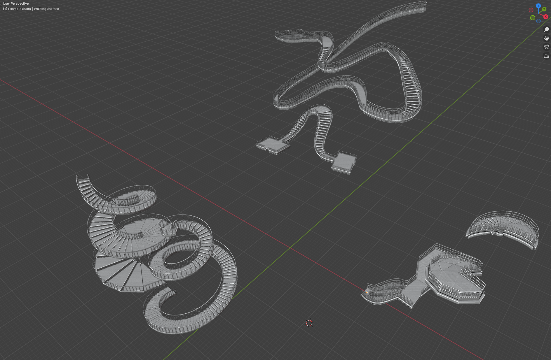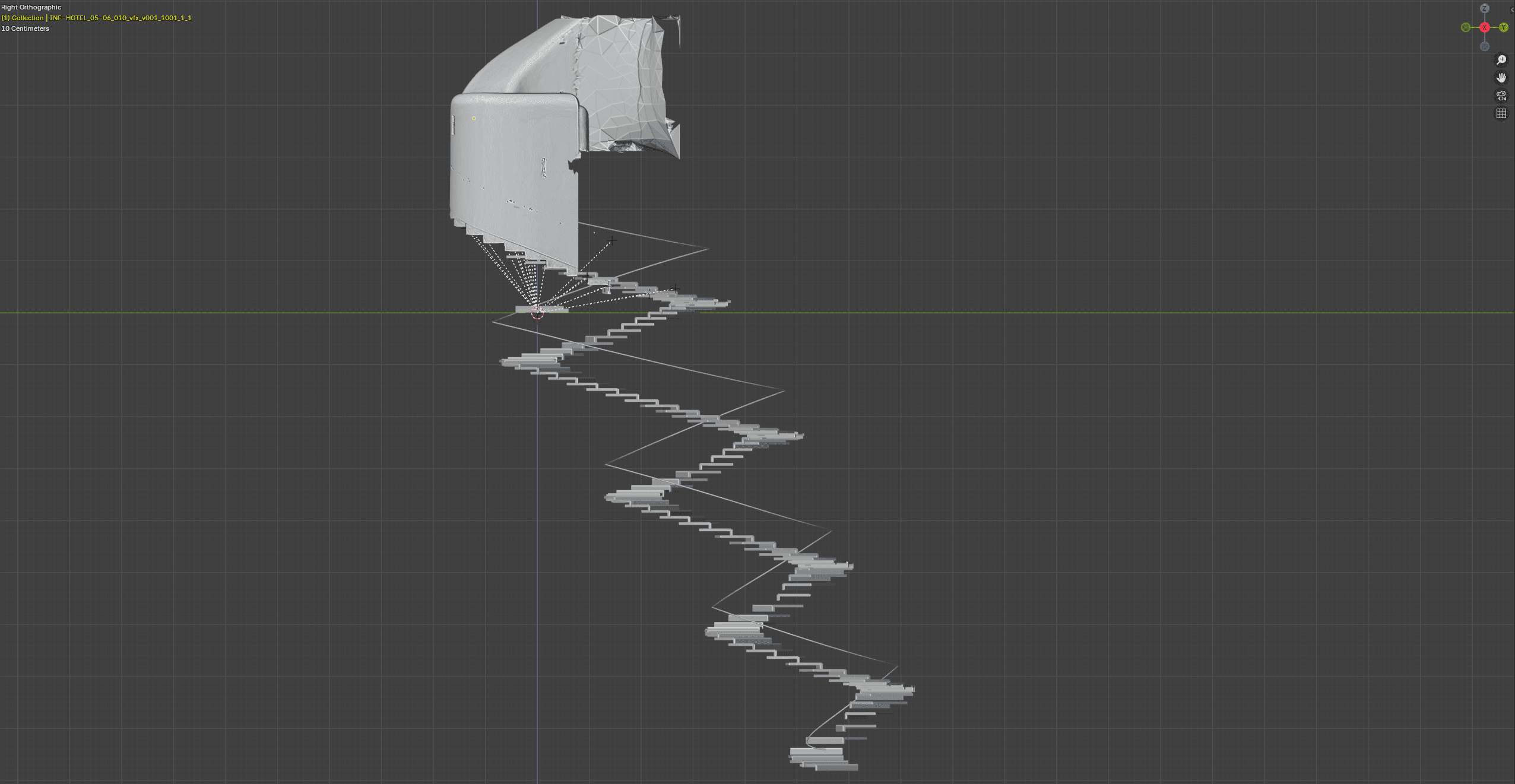 It was striking to see how precisely the point clouds generated by Faro Scene replicated the physical world. The resulting model was adjusted and extracted in Blender, where Vanessa and Jim animated the structure. The deformation of the staircase was particularly complex and was achieved using a geometry node system in Blender. Vanessa recreated the staircase texture in Substance Painter, based on reference photos taken on location by the entire VFX team.