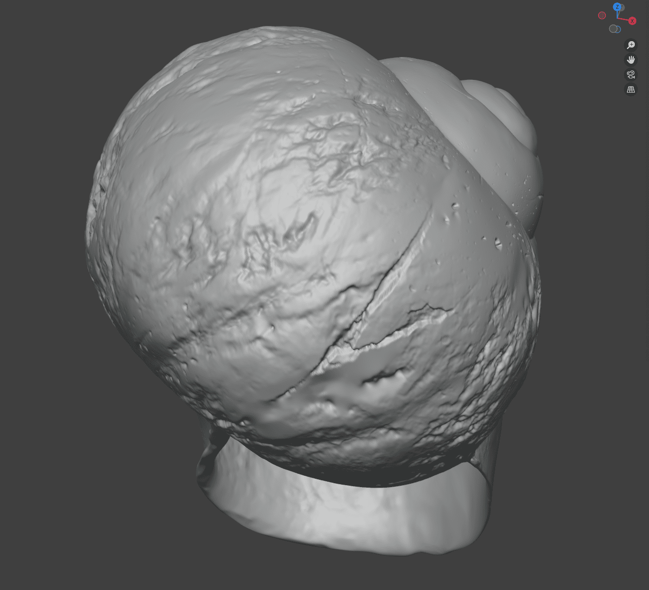 At the beginning, a more classic texture was planned for the snail. As the planning progressed, however, the idea emerged to give it a subtle resemblance to a skull. Elena Rid then stretched the 3D model of the snail so that the spiral at its center would recall the hairstyle of Clarence’s mother. During sculpting, the student worked in fine cracks. Elena mainly used the cloth brush to add further small, swirling details and folds to the surface. Small indentations and a pore-covered structure were also incorporated into the sculpt. Elena primarily based this work on the previously created concept art and additional reference photos of old bones.