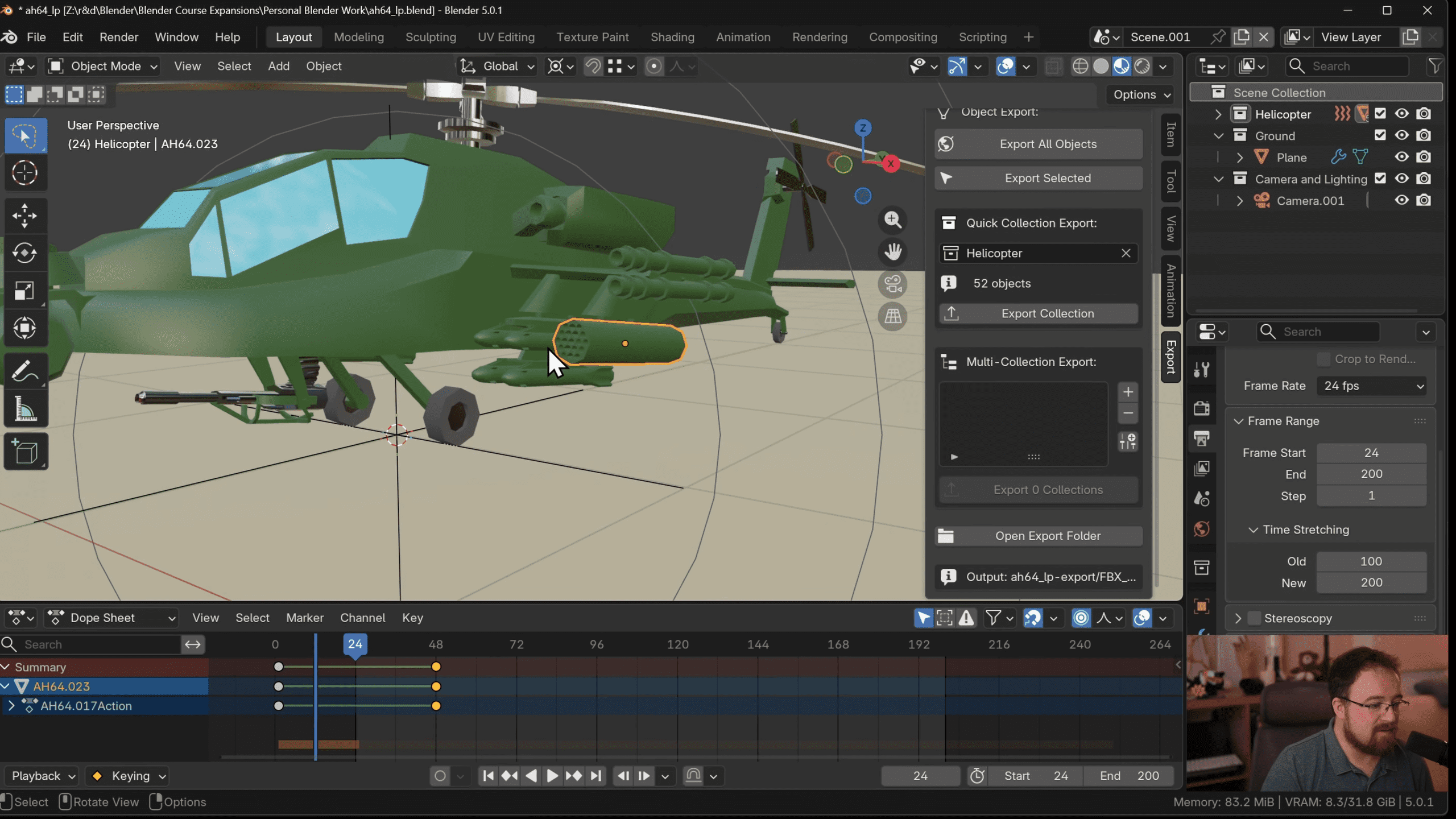 In a demonstrated example, a helicopter asset consisting of 52 objects is exported as a single FBX file by selecting its parent collection. The resulting file contains all objects merged into a single export operation. This behaviour is consistent with Blender’s standard FBX exporter and does not automatically instance repeated meshes.
