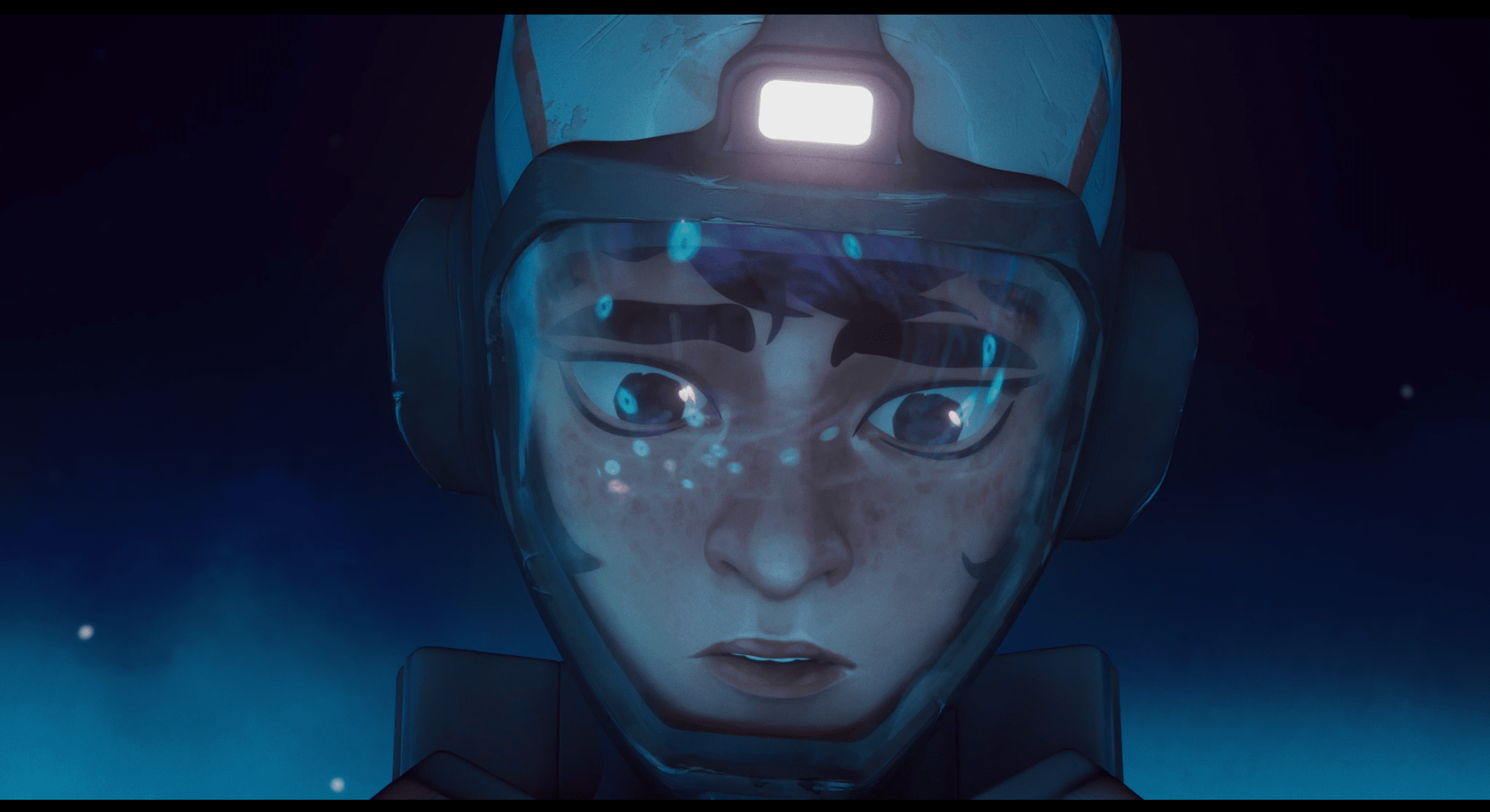 Each of these decisions influenced not only her final appearance, but also the types of scenes we could realistically include in the film. We put a lot of emphasis on Aamu’s design, as she appears in the majority of shots and thus carries a lot of visual weight in the film. Regarding the latter of the questions above, in the end, we even made use of the reflective visor as an active element of our storytelling (see image)