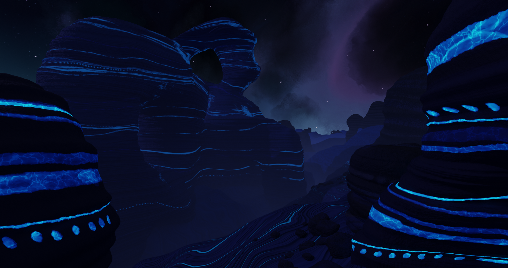 This way, we could give our planet a distinctly otherworldly appearance, centred around bioluminescence as the core aesthetic. Flowers and creatures glow in the dark, bringing the planet to life at night and reinforcing its alien nature.