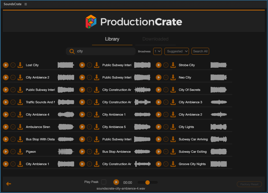 As a special gimmick, Production Crate offers a plug-in that allows access to the sound effects directly from Premiere. Using a separate window in the editing programme, users can browse the sound library, listen to samples, and, if they find what they are looking for, download the element with a single click and insert it into the timeline at the position of the playhead. The plug-in is clever enough not to overwrite existing elements in the sequence but instead to create a new audio track.