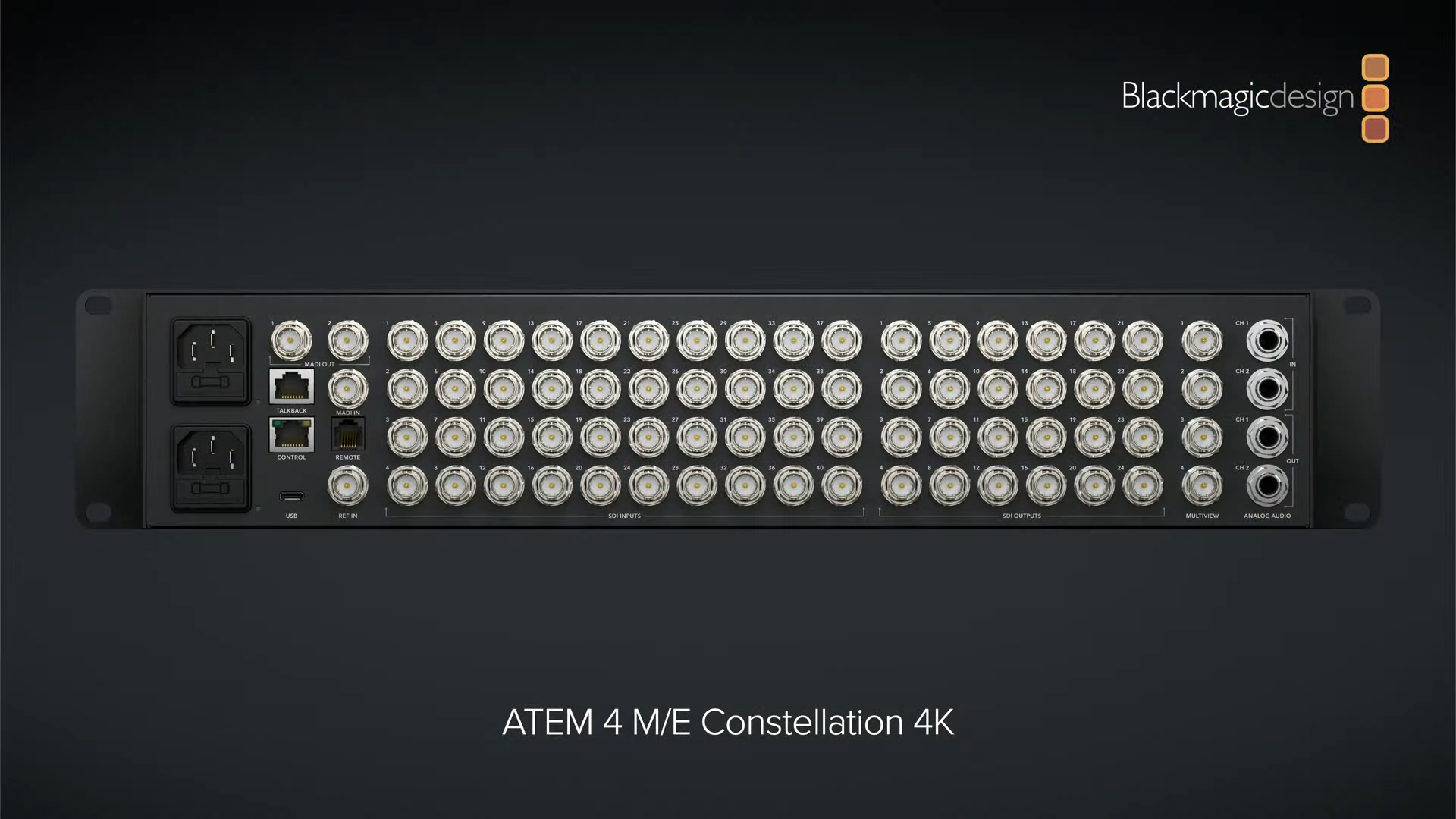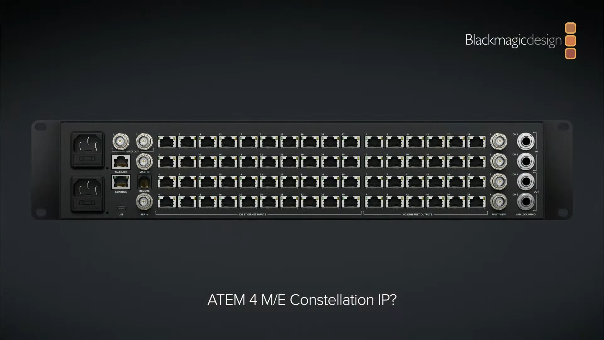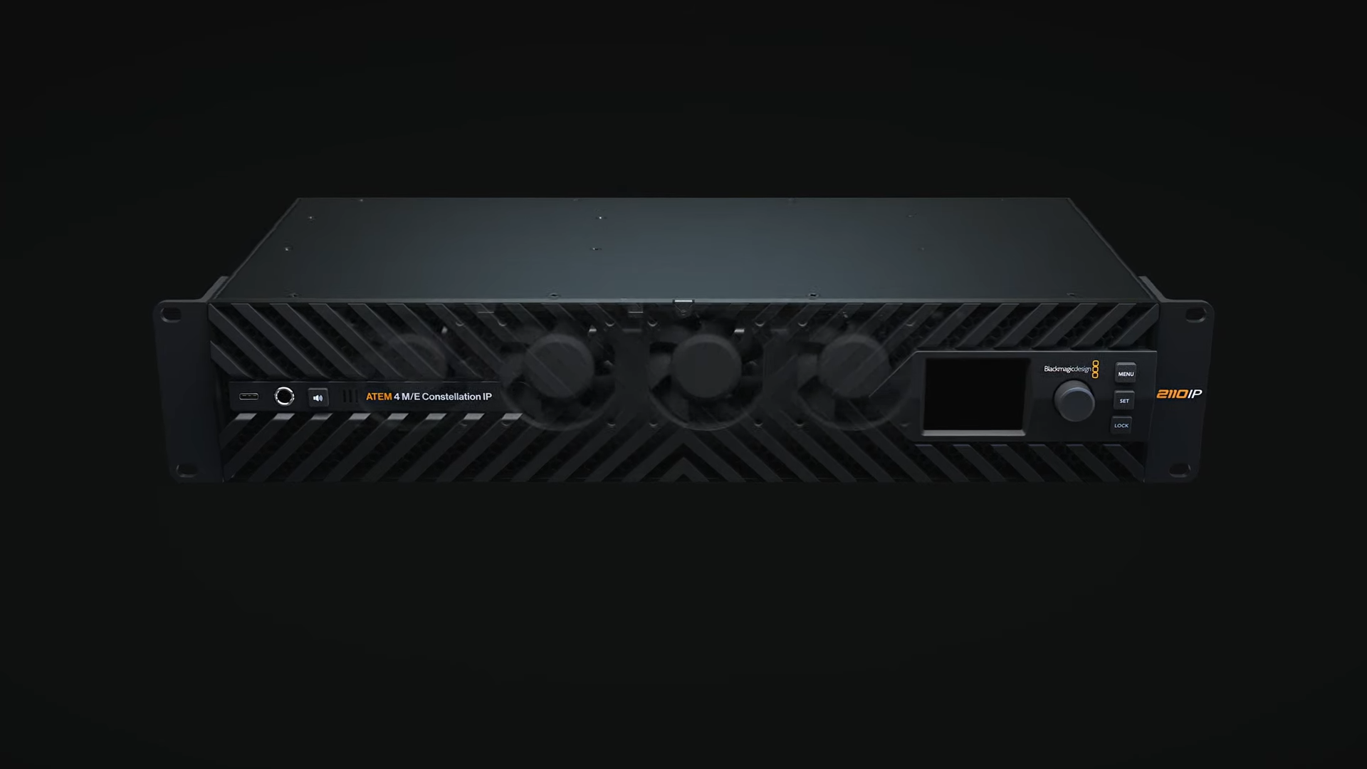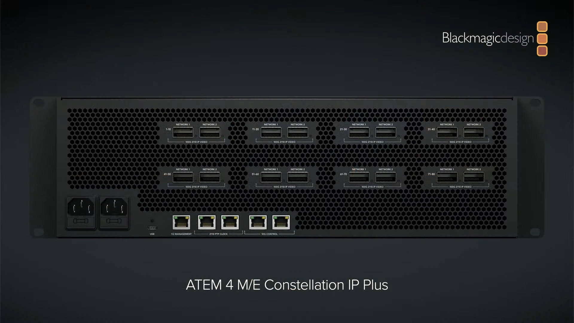 The centre of gravity is a new class of native 2110 switchers, designed around 100G links rather than baseband trunks. The ATEM 4 M/E Constellation IP moves the Constellation line into a 100G design with 32 inputs and 28 outputs. It includes standards conversion on every input, four multiview outputs, 16 ATEM Advanced Keyers, four DVEs, and two SuperSource processors. A larger three-rack-unit model targets bigger sports and broadcast work with 64 inputs and 52 outputs.