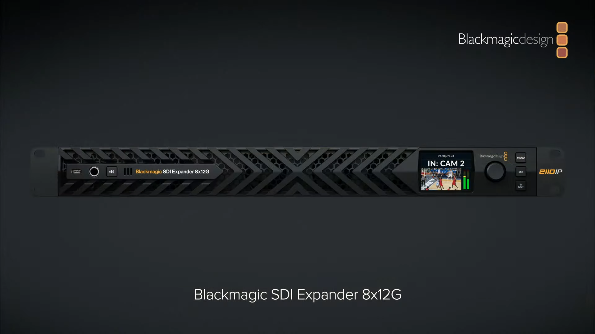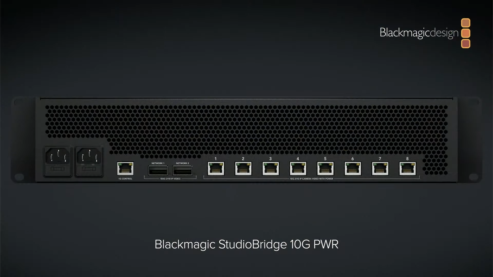 A pile of new rack hardware is positioned as glue between the new switchers and the wider world. Blackmagic SDI Expander 8x12G converts a 100G connection into eight 12G-SDI inputs and eight 12G-SDI outputs, aimed at bridging IP cores to SDI edges. Blackmagic Studio Bridge 10G PWR aggregates eight separate 10G Ethernet connections into a 100G link and adds 90 watts of PoE per port, intended to power multiple Studio Camera Pro 6K systems from a single bridge. The Ethernet layer here leans on IEEE 802.3 Ethernet concepts, and the power spec ties into Power over Ethernet as a technology class.